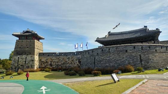 水原华城是1794年到1796年之间筑成的。用5743块石头筑成的城墙高度在4m到6m之间。东西南北四个方面都有城门,北门称长安门,南门称八达门,东门称苍龙门,西门称华西门。水原城内还有小溪流经,小溪与城墙相遇处则设置了水门,共有7个拱形水门可供小溪流过,其上修建了名叫华虹门的楼阁。从1975年开始到1979年修复工程开始实施。1997年12月被联合国教科文组织认定为世界文化遗产。