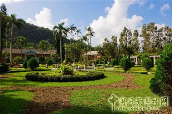 整个园区古树参天,群花竞秀,景色清幽。外花园种植着蒋介石与宋美龄喜爱的梅树、玫瑰、芒果、杨桃等花木,是二人挽手散步的好去处。被铁栏圈住的内花园,假山奇石围绕水池,池旁有个一人多高的大鸟笼,当年曾饲有文鸟、小黄莺等常见鸟类。据说,蒋介石最爱临池观鱼,自称"爱养鱼胜过钓鱼"。池子后面的两层瓦顶水泥洋房就是正馆,外墙漆成深绿色,与背后的青山绿树融为一体。